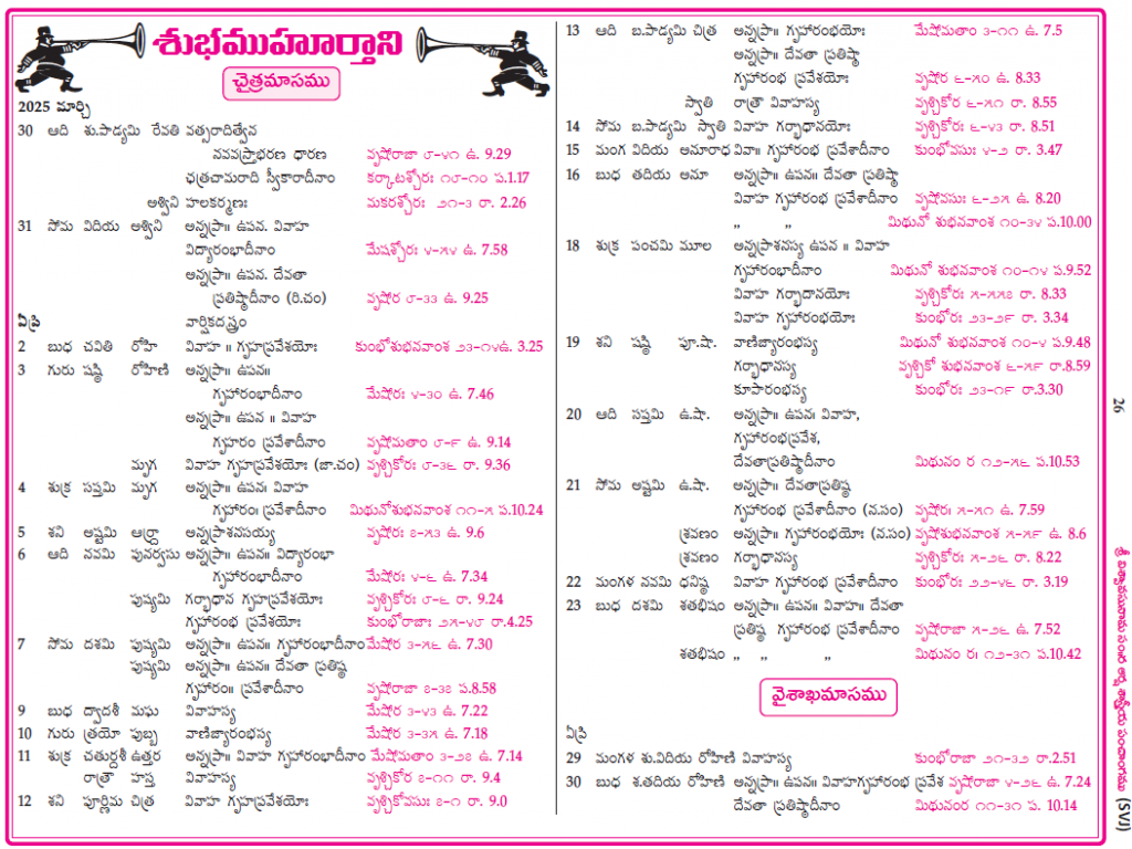 సుముహూర్తము విభాగంలో వివాహాలు, గృహప్రవేశం మరియు ఇతర శుభకార్యాలకు అనుకూలమైన ముహూర్తాలను అందిస్తాము.